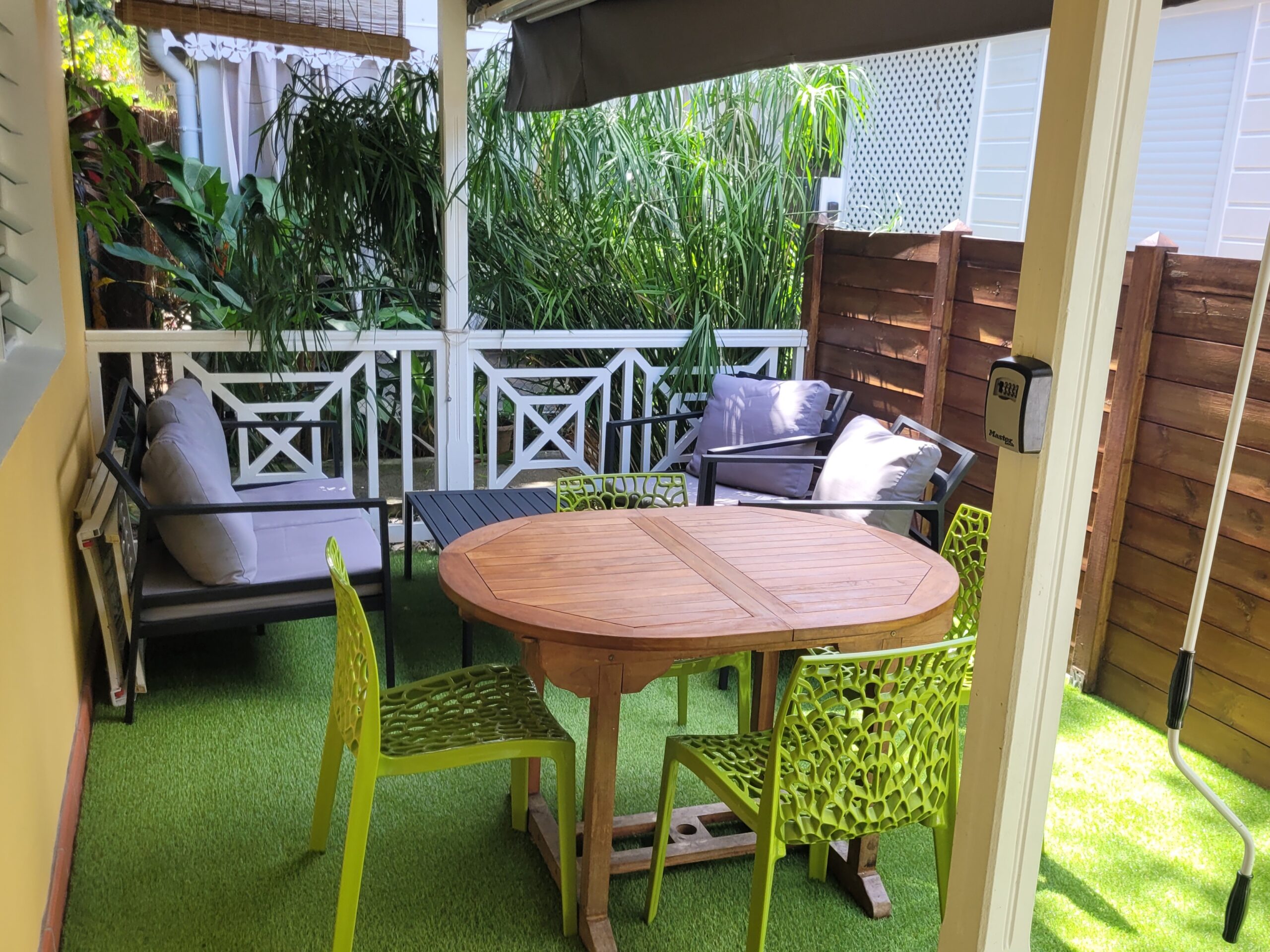 - Terrasse couverte de 18m2 avec table, chaises et salon extérieur